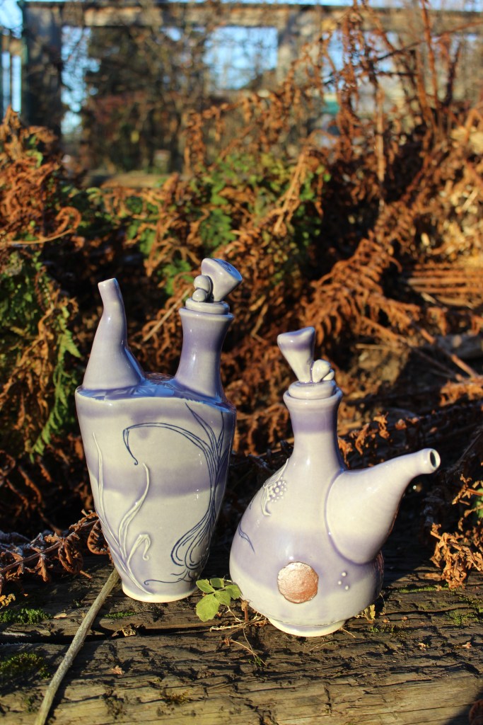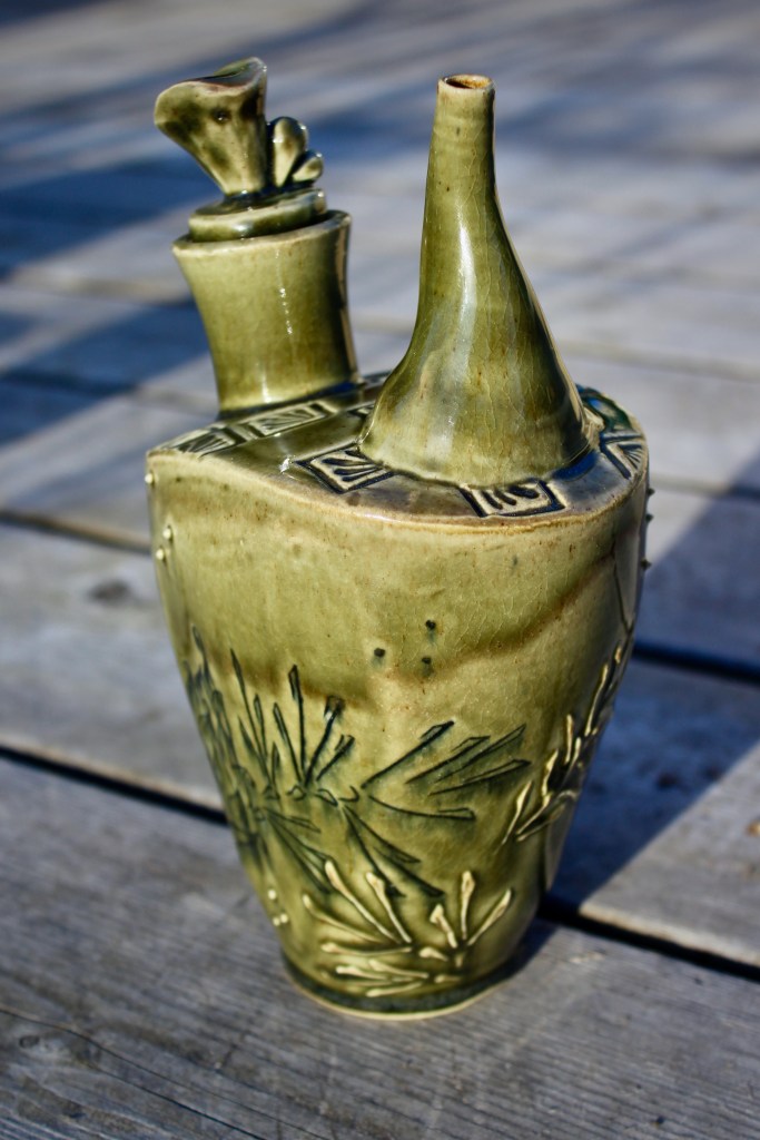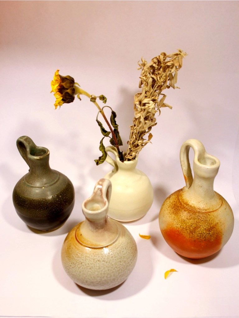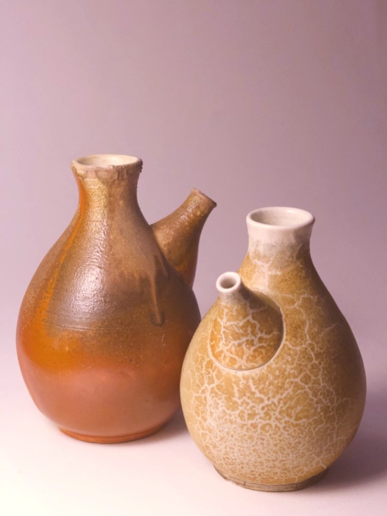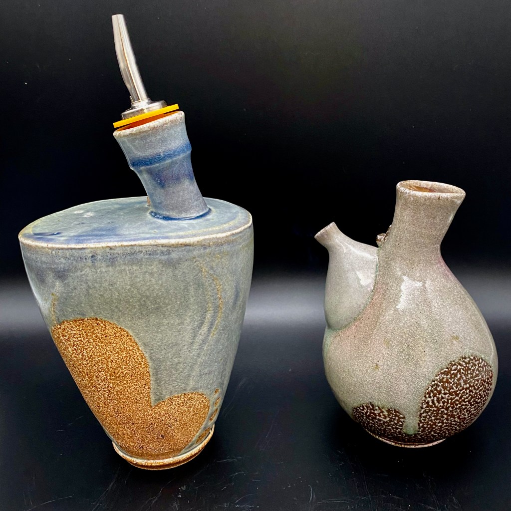 These are some of my favorite forms to play around with. I have always loved the process of making spouts. These are a selection of bottles made over thee last several years. I like to look back and see the evolution of my forms. Something about the bottle form has attracted me over the years, I always loved the wide belly containment rising up to a narrow top. Recently, as a response to the wider shape I kept returning to, I developed the taller lifted bottle form to juxtapose the grounded shape of the wide bellied bottle.